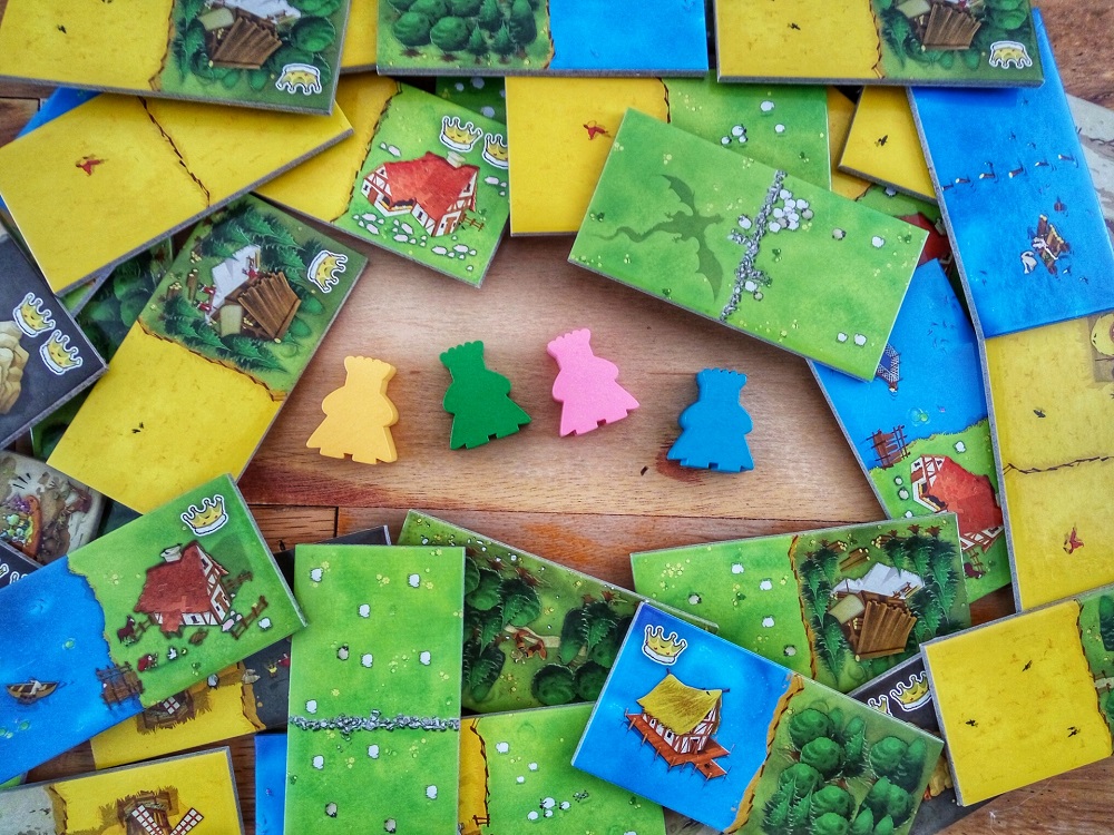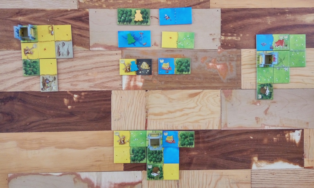 La otra cosa en la que siento que falla es en su modo a tres jugadores. A cuatro jugadores funciona perfecto. A dos jugadores se convierte en un juego bastante interesante en el que cada jugador controla dos meeples. Pero a tres jugadores el juego pide que quites algunas losetas al azar. Esto quiere decir que algunos terrenos que estás buscando puede nunca salgan en todo el juego y no hay manera de saberlo. Lo convierten en un juego con mucha más incertidumbre y sin cómo mitigarla.