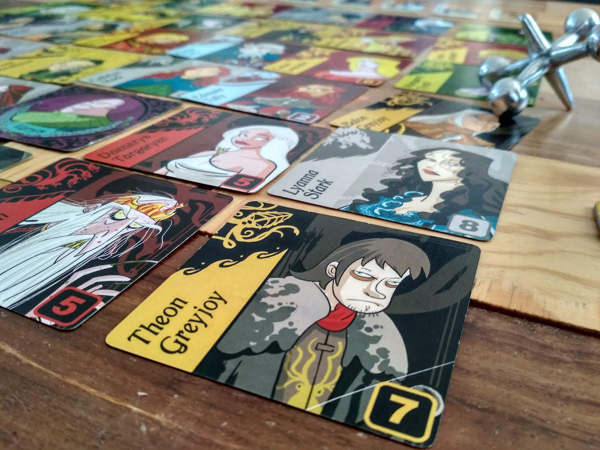 El juego incluye cartas cuadradas con algunos de los personajes de la saga. Cada una de las cartas incluye el nombre del personaje, la Casa a la que pertenece y cuántos personajes componen esa casa. La única carta que no tiene eso es la de Varys. Además, el juego incluye losetas representando los estandartes de cada casa.