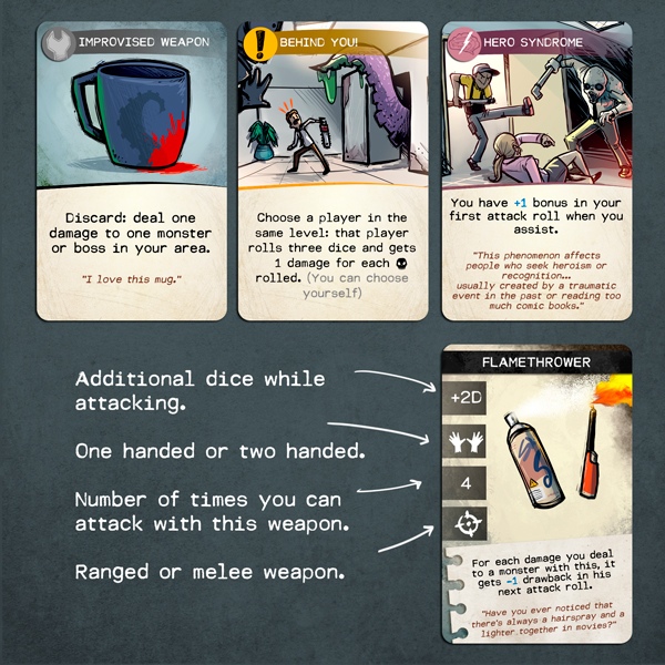 La primera es la temática, la cual lo hace muy interesante si les gustan los escenarios lovecraftianos y post-apocalípticos. Como lo dicen en su Kickstarter: «Serán perseguidos por monstruos que alguna vez fueron sus compañeros de trabajo, monstruosidades extradimensionales e incluso la malvada fotocopiadora. Cuando lleguen arriba, deberán enfrentar al “jefe final”. Si tu o cualquiera de tus compañeros lo derrotan, todos los jugadores ganan.».