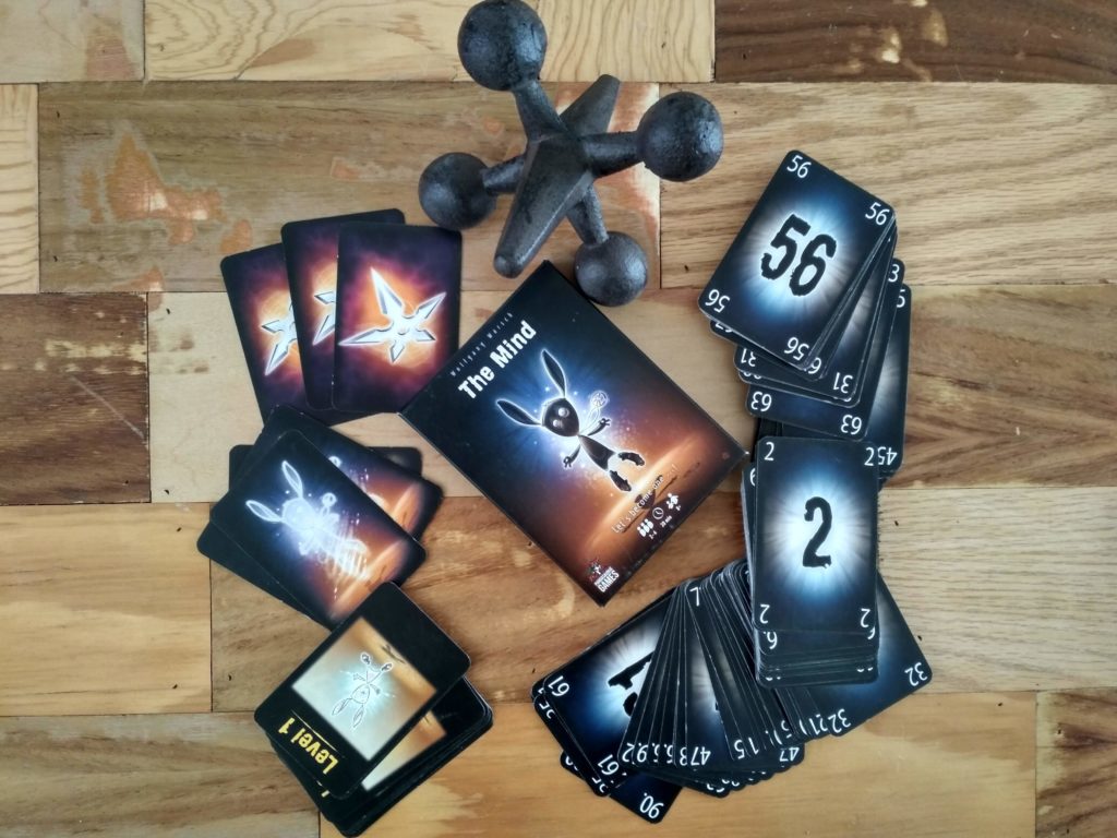 The Mind es un juego cooperativo de caja pequeña para 2 a 4 jugadores, que incluye un mazo de cartas con números del 1 al 100. Además, incluye cartas con un conejo de peluche, que representan las vidas. Hay cartas especiales que tienen una estrella ninja (shuriken, 手裏剣). Y también hay cartas que se usan para llevar los «niveles» en los que van los jugadores.